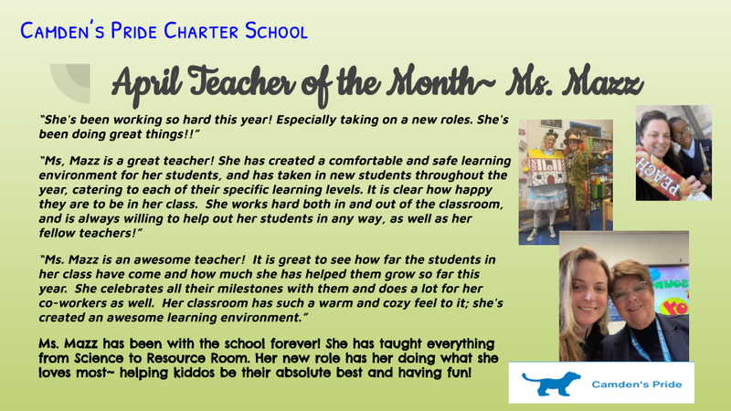 Congratulations to Ms. Mazz, Camden's Pride's April Teacher of the Month! Thank you for all that you do!