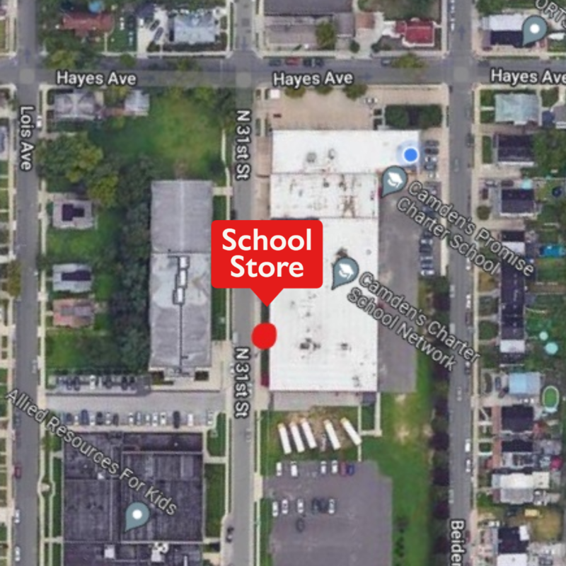 The School Store is located in the 8th Grade Vestibule at Camden’s Promise, which can be easily accessed from N 31st Street. It is through the last set of doors, closest to the big parking lot in the back.