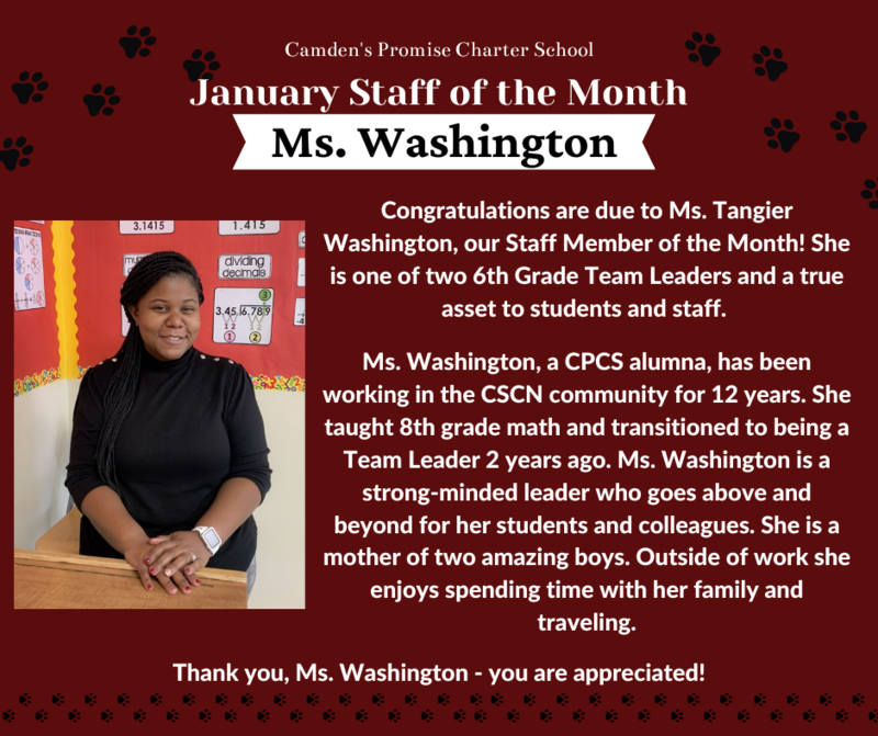 Congratulations to Mrs. Merrigan & Ms. Washington our Camden's Promise January Teacher & Staff member of the month!